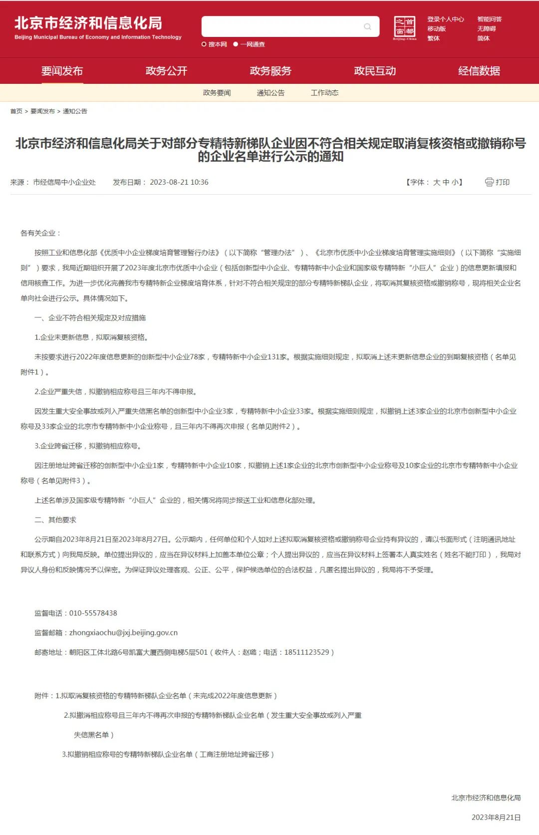 8月21日,北京市經(jīng)信局官網(wǎng)公布消息顯示,為進(jìn)一步優(yōu)化完善北京市專(zhuān)精特新企業(yè)梯度培育體系,針對(duì)不符合相關(guān)規(guī)定的部分專(zhuān)精特新梯隊(duì)企業(yè),將取消其復(fù)核資格或撤銷(xiāo)稱(chēng)號(hào),并將相關(guān)企業(yè)名單向社會(huì)進(jìn)行公示。公示名單共涉及北京174家專(zhuān)精特新中小企業(yè)和82家創(chuàng)新型中小企業(yè)!