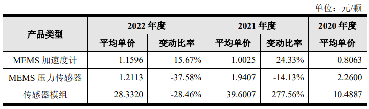 從市場(chǎng)的角度來(lái)看,以上產(chǎn)品中,MEMS加速度計(jì)單價(jià)呈上升趨勢(shì),MEMS壓力傳感器和傳感器模組呈下降趨勢(shì)。該公司對(duì)單價(jià)上升的解釋為:主要系品牌客戶占比提高、產(chǎn)能緊缺背景下單價(jià)的上調(diào)所致。