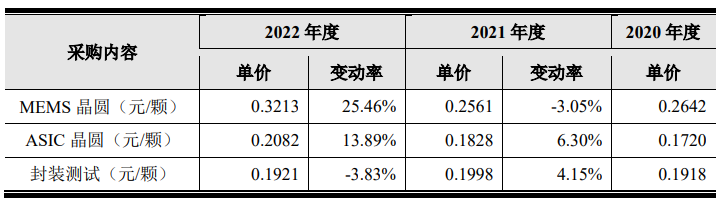 目前,明皜傳感的采購(gòu)內(nèi)容主要有MEMS晶圓、ASIC晶圓、封裝測(cè)試。通過(guò)其招股書可以發(fā)現(xiàn),晶圓類材料價(jià)格在去年漲價(jià)幅度較大。其解釋為: