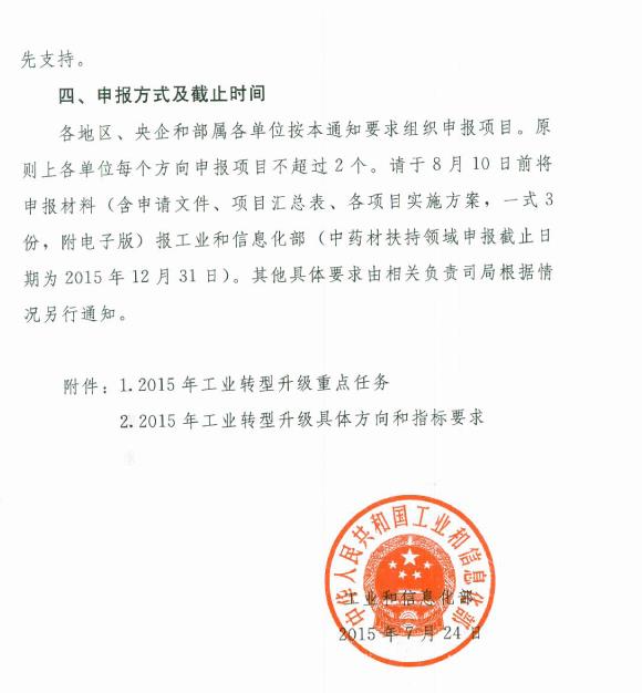 7月27日,工信部發布關于2015年工業轉型升級重點項目指南的通知。根據通知,2015年轉型升級資金重點針對智能制造和“互聯網 ”行動支撐保障能力、綠色制造、中藥材提升與保障、工業強基等4大重點領域和中小企業服務體系重點專項,共實施20項任務73個方向。