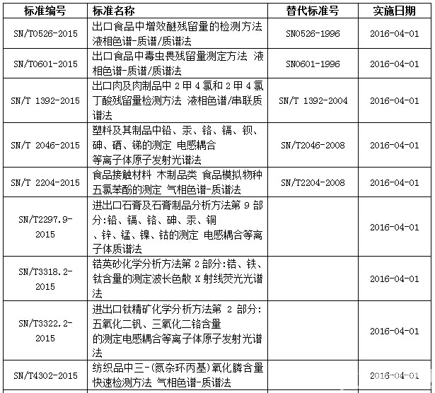 9月2日,質(zhì)檢總局發(fā)布關(guān)于2015年第三批103項(xiàng)出入境檢驗(yàn)檢疫行業(yè)標(biāo)準(zhǔn)的通知,其中20余項(xiàng)涉及色譜、質(zhì)譜及光譜儀器檢測(cè)方法,被代替標(biāo)準(zhǔn)自本批標(biāo)準(zhǔn)實(shí)施之日起廢止。