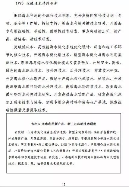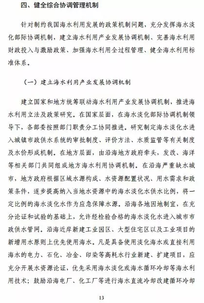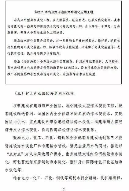 規(guī)劃要求,在沿海缺水城市、海島、產(chǎn)業(yè)園區(qū)和西部苦咸水地區(qū)等重點(diǎn)領(lǐng)域和電力、鋼鐵、石化等重點(diǎn)行業(yè)大力推進(jìn)海水利用的規(guī)模化應(yīng)用,開展海水利用示范城市、示范海島、示范園區(qū)等的建設(shè),推廣可復(fù)制的海水利用典型模式。