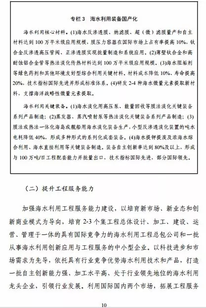 導(dǎo)讀:發(fā)改委、海洋局組織編制并印發(fā)《全國海水利用“十三五”規(guī)劃》提出,到2020年海水利用實(shí)現(xiàn)規(guī)模化應(yīng)用,最終形成城市保障、海島示范、園區(qū)率先、行業(yè)深化、苦咸水拓展、“一帶一路”延伸的新格局。同時(shí),探索實(shí)行政府和社會(huì)資本合作(PPP)模式。