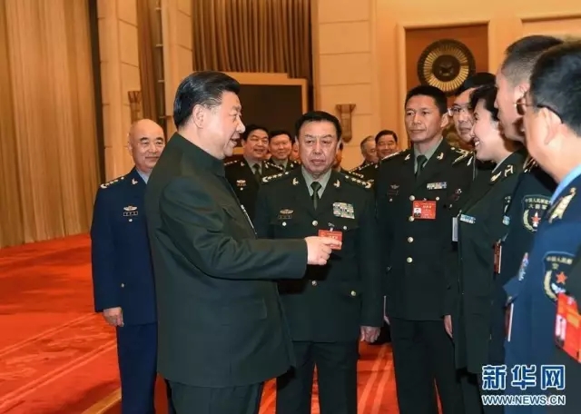 代表發言后,習近平發表重要講話。他強調指出,黨的十八大以來,在黨中央和中央軍委領導下,全軍圍繞實現強軍目標,統一思想,抓緊工作,國防和軍隊改革實現歷史性突破,軍事斗爭準備取得重大進展,反腐敗斗爭形成壓倒性態勢,我軍建設呈現嶄新氣象。