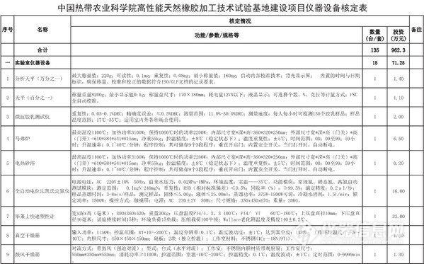 農業部近日發布公告,批復中國熱帶農業科學院下設儋州農業環境科學觀測實驗站、高性能天然橡膠加工技術試驗基地兩家實驗室建設項目的可行性報告。預計采購全自動凱氏定氮儀、紫外-可見光光度計、分析天平、馬弗爐等29套實驗室分析儀器設備,項目儀器設備購置費用總計1203.6萬元。