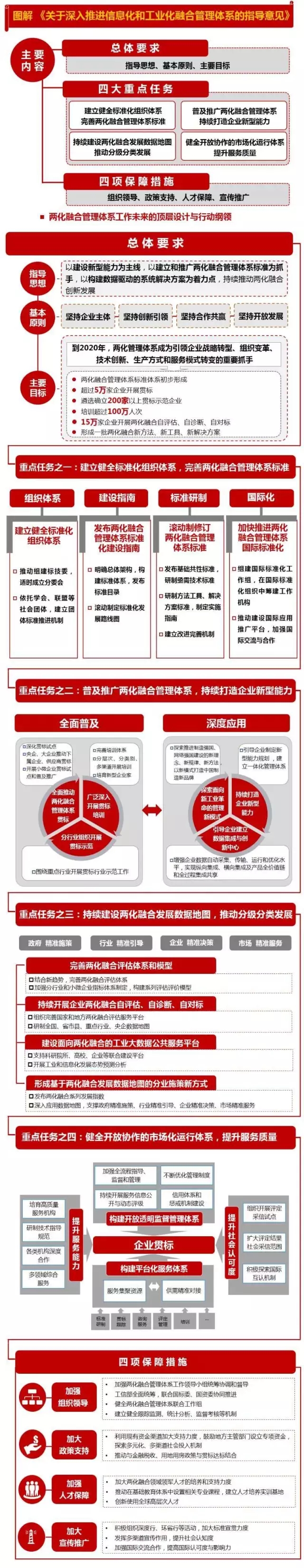 《指導(dǎo)意見(jiàn)》面向政府、行業(yè)協(xié)會(huì)、科研院所、社會(huì)組織、服務(wù)機(jī)構(gòu)、企業(yè)等兩化融合管理體系推進(jìn)和應(yīng)用主體,圍繞兩化融合管理體系標(biāo)準(zhǔn)研制、兩化融合管理體系貫標(biāo)推廣、兩化融合發(fā)展數(shù)據(jù)地圖建設(shè)、市場(chǎng)化運(yùn)行體系構(gòu)建等方面,部署了四項(xiàng)重點(diǎn)任務(wù)。一是在標(biāo)準(zhǔn)研制方面,提出要“建立健全標(biāo)準(zhǔn)化組織機(jī)構(gòu),完善兩化融合管理體系標(biāo)準(zhǔn)”,主要包括:推動(dòng)組建全國(guó)兩化融合管理體系標(biāo)準(zhǔn)化技術(shù)委員會(huì),發(fā)布兩化融合管理體系標(biāo)準(zhǔn)化建設(shè)指南,滾動(dòng)制修訂兩化融合管理體系系列標(biāo)準(zhǔn),加快推進(jìn)兩化融合管理體系國(guó)際標(biāo)準(zhǔn)化等內(nèi)容。二是在貫標(biāo)廣度和深度方面,提出要“普及推廣兩化融合管理體系,持續(xù)打造企業(yè)新型能力”,主要包括:深化國(guó)家和地方兩化融合管理體系貫標(biāo)試點(diǎn),引導(dǎo)央企、大型集團(tuán)企業(yè)推動(dòng)下屬企業(yè)及供應(yīng)商全面開(kāi)展貫標(biāo);分行業(yè)組織開(kāi)展貫標(biāo)示范,建設(shè)完善培訓(xùn)體系,分層次、分類(lèi)別深入開(kāi)展貫標(biāo)培訓(xùn);引導(dǎo)企業(yè)制定新型能力規(guī)劃,構(gòu)建并持續(xù)打造新型能力;引導(dǎo)企業(yè)建立數(shù)據(jù)集成與創(chuàng)新中心;探索面向新工業(yè)革命的管理新模式等內(nèi)容。三是在數(shù)據(jù)要素創(chuàng)新應(yīng)用方面,提出要“持續(xù)建設(shè)兩化融合發(fā)展數(shù)據(jù)地圖,推動(dòng)分級(jí)分類(lèi)發(fā)展”,主要包括:結(jié)合新趨勢(shì),完善兩化融合評(píng)估體系,加強(qiáng)分行業(yè)指標(biāo)體系和小微企業(yè)指標(biāo)體系制定,構(gòu)建系列評(píng)估評(píng)價(jià)模型;持續(xù)推進(jìn)企業(yè)兩化融合自評(píng)估、自診斷、自對(duì)標(biāo),發(fā)布全國(guó)、省市縣各級(jí)區(qū)域、重點(diǎn)行業(yè)、中央企業(yè)兩化融合發(fā)展數(shù)據(jù)地圖,形成基于兩化融合發(fā)展數(shù)據(jù)地圖的分業(yè)施策新方式;建設(shè)工業(yè)大數(shù)據(jù)公共服務(wù)平臺(tái),開(kāi)展工業(yè)和信息化發(fā)展態(tài)勢(shì)預(yù)測(cè)分析等內(nèi)容。四是在市場(chǎng)化運(yùn)行體系方面,提出要“健全開(kāi)放協(xié)作的市場(chǎng)化運(yùn)行體系,提升服務(wù)質(zhì)量”,主要包括:提升第三方服務(wù)機(jī)構(gòu)的綜合服務(wù)能力,構(gòu)建線上線下協(xié)同的平臺(tái)化服務(wù)體系,建立開(kāi)放透明的監(jiān)督管理體系,組織開(kāi)展兩化融合管理體系評(píng)定采信試點(diǎn),提升兩化融合管理體系的社會(huì)認(rèn)可度等內(nèi)容。