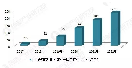 2017-2022年全球蜂窩通信網絡物聯網連接數預測(單位:億個連接)