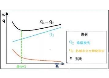 鍋爐的燃燒效率與鍋爐的氧含量有直接的關(guān)系,在散熱損失與灰渣顯熱損失相對不變的情況下,如果氧量過低,排煙損失q2雖然較低,但是機械未完全燃燒損失q4卻很高,總體效率還是較低。如果氧量過高,排煙損失q2明顯增高,即使機械未完全燃燒損失q4較低,但是總體效率依然較低,具體氧含量與鍋爐效率損失可用圖4所示的曲線表達。