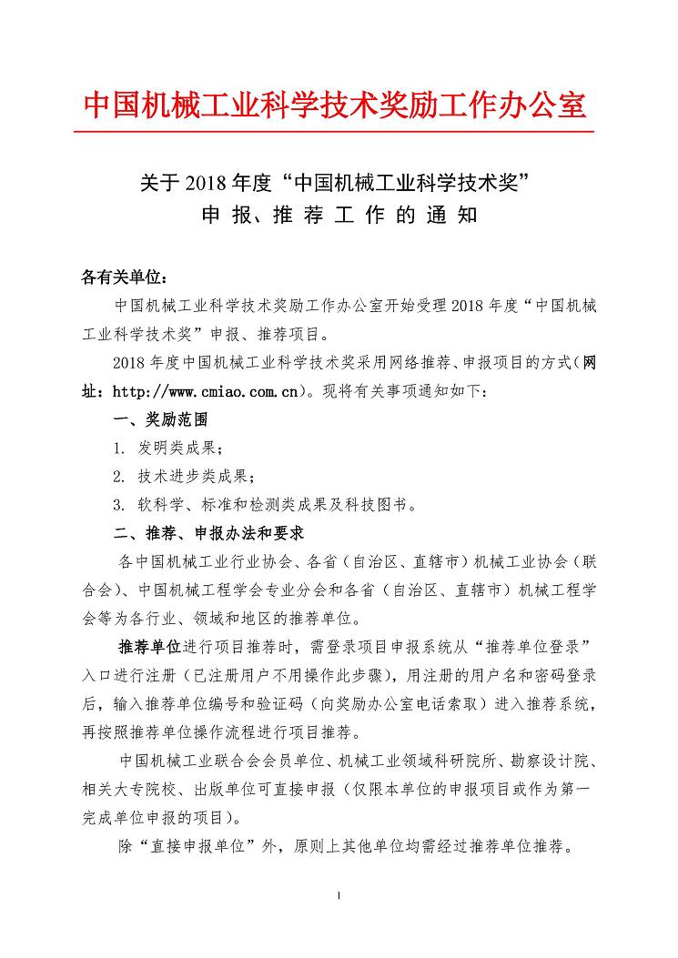 關(guān)于2018年度“中國(guó)機(jī)械工業(yè)科學(xué)技術(shù)獎(jiǎng)”申報(bào)、推