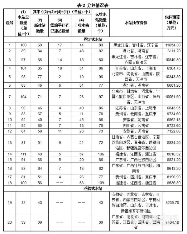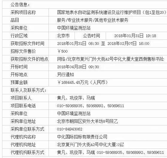 2018年1月31日,中國政府采購網發布《中國環境監測總站國家地表水自動監測系統建設及運行維護項目(包1至包20)公開招標公告》,此項目總預算為168445.45 萬元,將分為20包,且有些包數同一廠商不能同時中標。