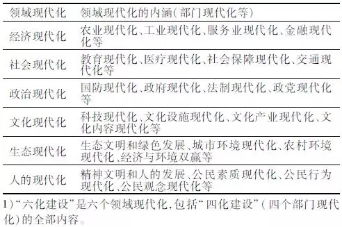 中國(guó)復(fù)興的建設(shè)內(nèi)容,從“四化建設(shè)”擴(kuò)展到“六化建設(shè)”,有可能實(shí)現(xiàn)全面復(fù)興。因?yàn)椋瑥摹安块T現(xiàn)代化”到“領(lǐng)域現(xiàn)代化”(表2),內(nèi)涵更豐富,內(nèi)容更全面,而且可以減少“部門因素”的不利影響。例如,經(jīng)濟(jì)現(xiàn)代化包括農(nóng)業(yè)現(xiàn)代化、工業(yè)和服務(wù)業(yè)現(xiàn)代化等,社會(huì)現(xiàn)代化包括教育現(xiàn)代化、醫(yī)療和交通現(xiàn)代化等,政治現(xiàn)代化包括國(guó)防現(xiàn)代化、政府和法制現(xiàn)代化等,文化現(xiàn)代化包括科技現(xiàn)代化、文化產(chǎn)業(yè)和文化內(nèi)容現(xiàn)代化等。