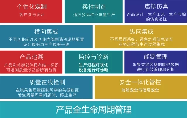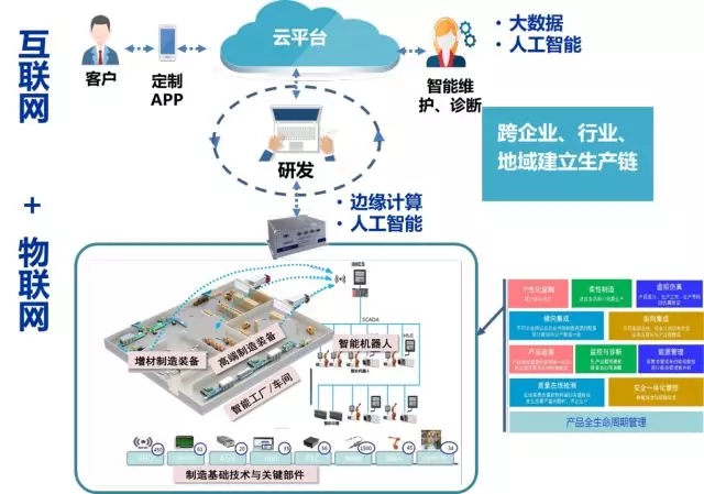 另一方面,借助互聯(lián)網(wǎng)、云、大數(shù)據(jù)能等新一代信息技術(shù)實現(xiàn)跨企業(yè)、跨行業(yè)、跨地區(qū)的網(wǎng)絡(luò)協(xié)同制造,以及利用人工智能技術(shù)實現(xiàn)智能產(chǎn)品的版本升級、遠程診斷和預(yù)測性維護等智能服務(wù),更進一步將分析結(jié)果反饋到規(guī)劃設(shè)計、產(chǎn)品開發(fā)、生產(chǎn)優(yōu)化,實現(xiàn)產(chǎn)品全生命周期的閉環(huán)控制。