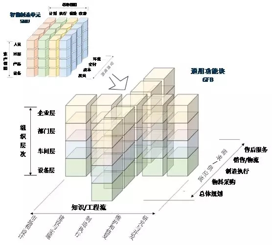 此外,從制造業(yè)整體出發(fā),企業(yè)實施智能制造具有通用的功能和活動。因此,IVRA還定義了通用功能塊(GFB),通過知識/工程流、需求/供應(yīng)流和企業(yè)組織層級三個軸向進行描述,如圖8所示。從工程角度出發(fā),知識/工程流包含的設(shè)計信息和工程信息,可劃分為市場和設(shè)計、構(gòu)造和實現(xiàn)、制造執(zhí)行、維護和修復(fù)、研究和開發(fā)五個通用功能。需求/供應(yīng)流是指由多家企業(yè)組成的價值鏈,涉及將原料轉(zhuǎn)變?yōu)樽罱K產(chǎn)品并運送至終端用戶的所有活動,包括總體規(guī)劃、原料采購、制造執(zhí)行、銷售與物流、售后服務(wù)。知識/工程流與需求/供應(yīng)流在制造執(zhí)行階段交匯因而具有共同的GFB。更進一步,智能制造通用功能分解到企業(yè)的各個垂直層級也形成不同的功能塊,自底向上包括設(shè)備層、車間層、部門層和企業(yè)層。