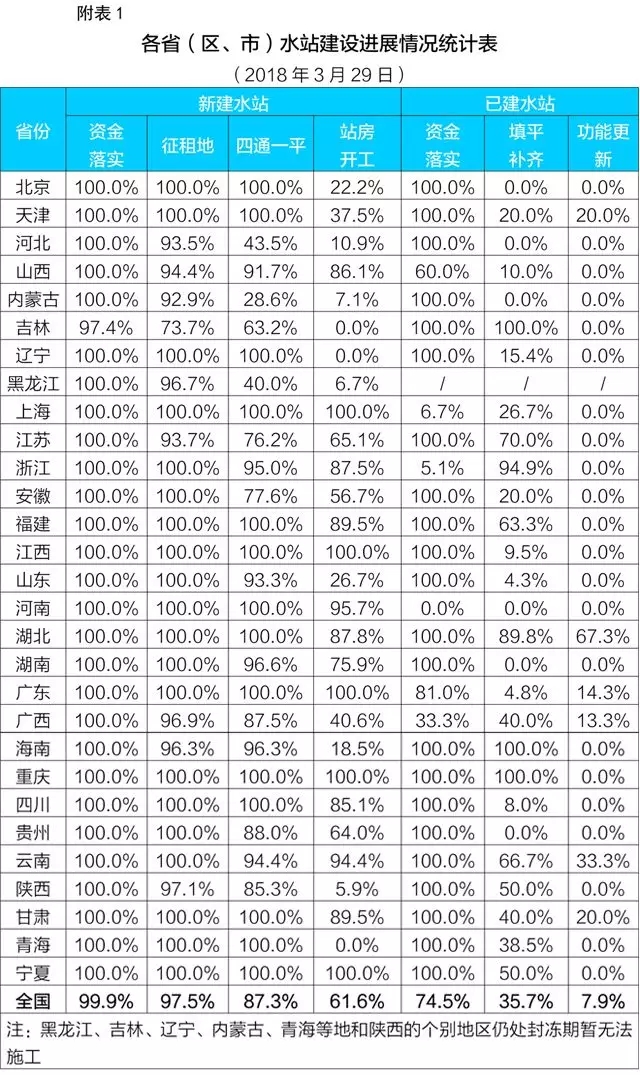 截至2018年3月29日,959個需地方新建的水站中,958個已落實經費,占99.9%,較上月提高21.4個百分點;935個完成征(租)地,占97.5%,較上月提高36.6個百分點;837個實現“四通一平”,占87.3%,較上月提高40.7個百分點;591個已開工建設(黑龍江、吉林、遼寧、內蒙古、青海等地和陜西的個別地區仍處封凍期暫無法施工),占61.6%,較上月提高53.7個百分點(詳見附表1)。