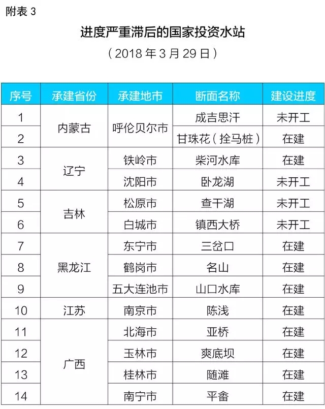 (四)部分國家投資需地方新建的水站建設進度嚴重滯后。按照《關于印發2015年國家水環境質量自動監測站新建項目建設方案的通知》(環辦函〔2015〕1730號)安排,由國家投資在各地新建58個水站,要求2017年12月底前全面建成。但截至目前,仍有部分水站建設進展嚴重滯后,還處于站房建設階段,個別水站甚至至今仍未開工建設。主要是6個省份的14個水站:廣西壯族自治區玉林市、北海市、桂林市、南寧市各1個,黑龍江省東寧市、鶴崗市、五大連池市各1個,內蒙古自治區呼倫貝爾市2個,遼寧省沈陽市、鐵嶺市各1個,吉林省松原市、白城市各1個,江蘇省南京市1個(詳見附表3)。