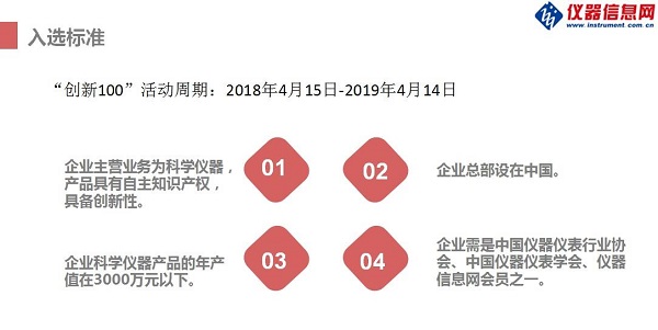 后續(xù),“創(chuàng)新 100”還將繼續(xù)走訪報(bào)道北京、天津、深圳、福建、江浙滬等地的儀器廠商,通過(guò)篩選“科學(xué)儀器行業(yè)最具成長(zhǎng)潛力企業(yè)”、撰寫中小儀器企業(yè)創(chuàng)新能力調(diào)研報(bào)告等形式,依托儀器信息網(wǎng)媒體資源,形成“創(chuàng)新 100”企業(yè)傳播的倍增效應(yīng)?!皠?chuàng)新 100”申報(bào)截止至 2018 年 12 月 31 日,歡迎符合如下條件的儀器企業(yè)積極申報(bào)。