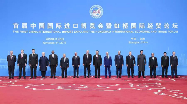 11月5日,首屆中國國際進口博覽會在上海開幕。國家主席習近平出席開幕式并發表題為《共建創新包容的開放型世界經濟》的主旨演講。這是開幕式前,習近平同外方領導人集體合影