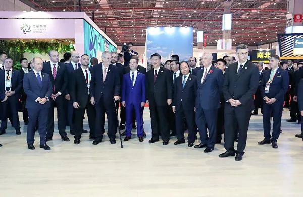 11月5日,國家主席習近平在上海同出席首屆中國國際進口博覽會的外國領導人共同巡館