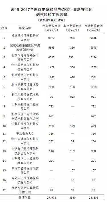 表15給出了參與調查各會員企業2017年燃煤電站和非電燃煤行業新簽合同脫硝工程總處理煙氣量情況。截至2017年底,參與調查的企業新簽合同脫硝工程總煙氣量為29,808萬Nm3/h(包括燃煤電站行業和非電燃煤行業),其中燃煤電站新簽占90%,非電新簽占10%。其中福建龍凈、國家電投集團遠達環保和北京國電龍源環保新簽合同的煙氣脫硝處理煙氣量最大,分別為9855萬Nm3/h、5878萬Nm3/h和5194萬Nm3/h。