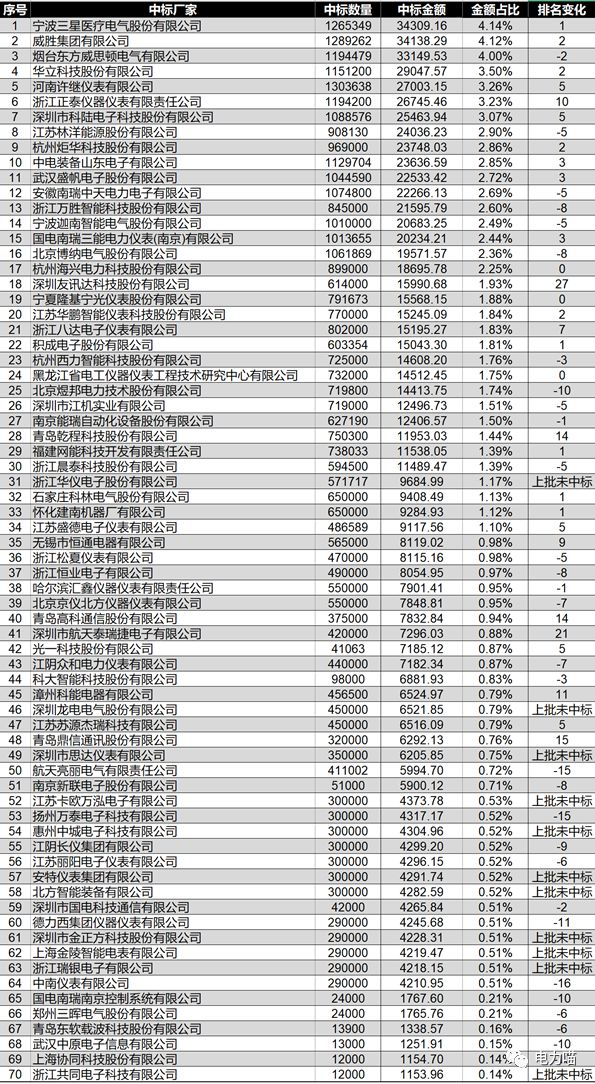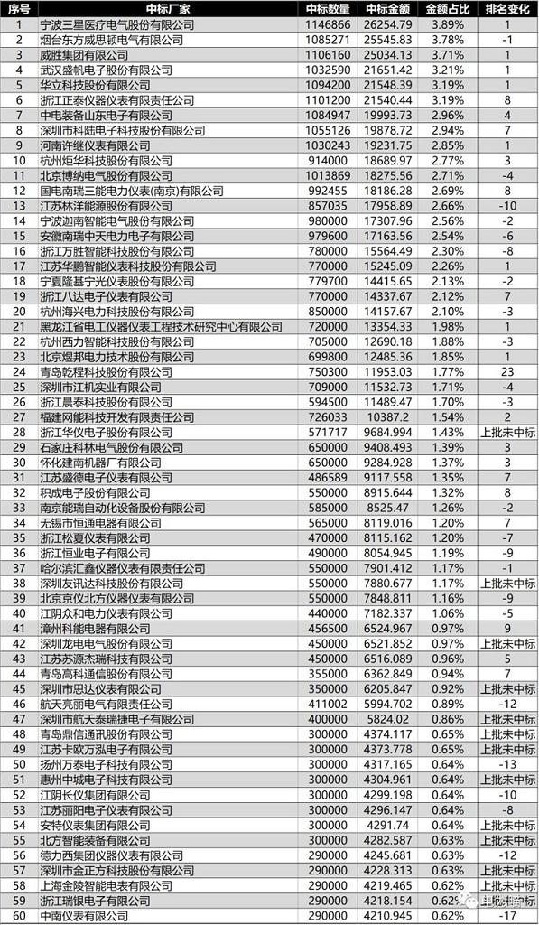 本次招標中標的企業,寧波三星醫療電氣股份有限公司以34309.16萬元排名第一;威勝集團有限公司以34138.29萬元排名第二;煙臺東方威思頓電氣有限公司以33149.53排名第三。