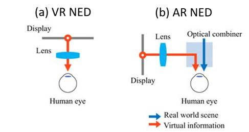 圖 1. (a) 虛擬現實(VR)近眼顯示系統的示意圖; (b) 增強現實(AR)近眼顯示系統的示意圖。