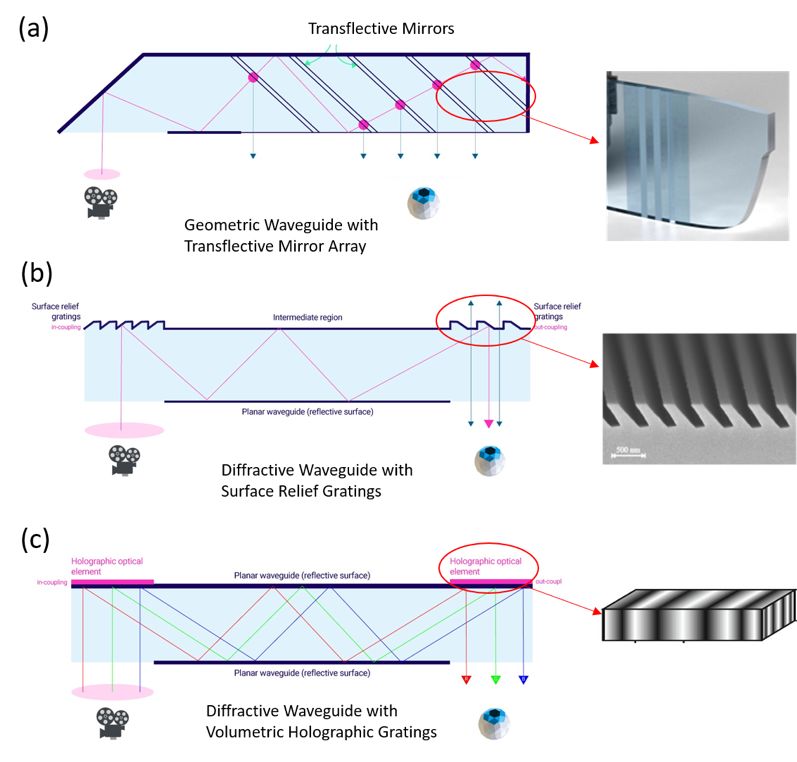 圖 4. 光波導的種類: (a) 幾何式光波導和“半透半反”鏡面陣列的原理示意圖,