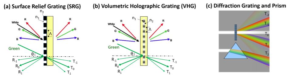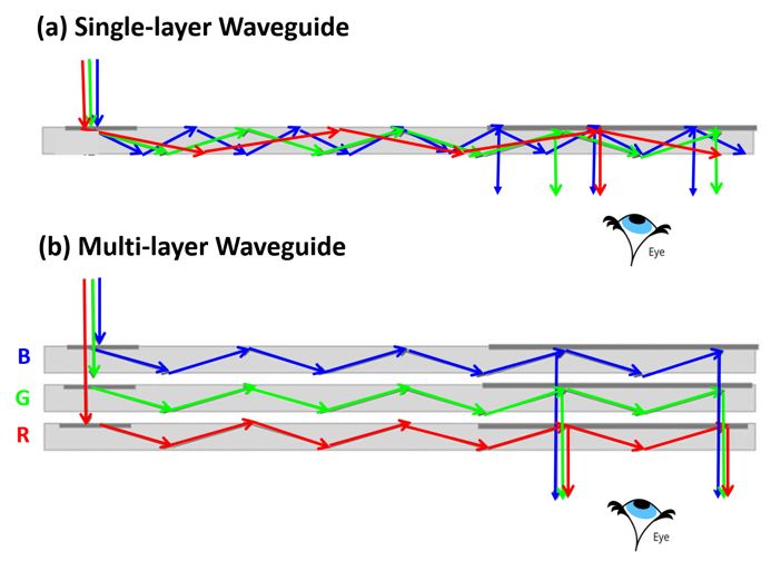 圖 7. 衍射光波導中的色散問題: (a) 單層光波導和光柵會引起出射光的“彩虹效應”,