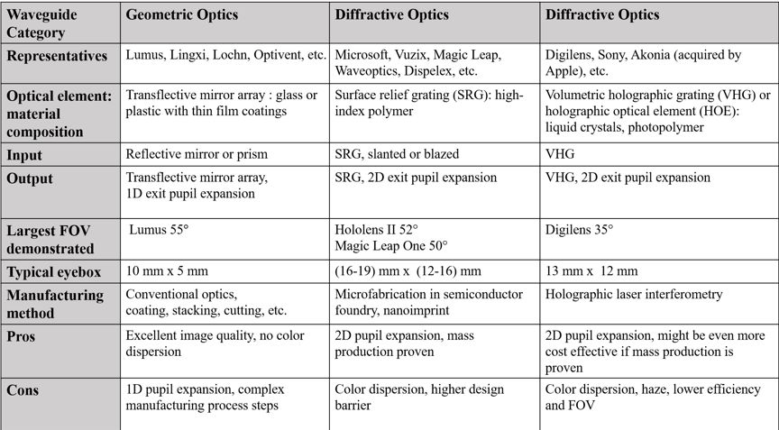 好了,說了這么多,讓我們比較下光波導的各個技術方案來看看究竟花落誰家,為了方便大家橫向比較我們總結了一個比較詳細的表格。
