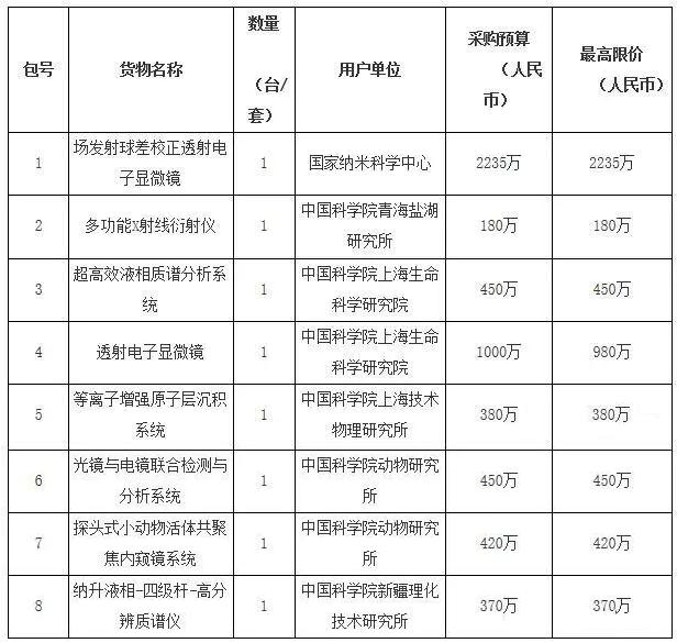 中國科學院發布2019年儀器設備部門集中采購項目(第二批)公開招標公告,預算6235萬采購10套儀器設備,包括冷凍微區分析掃描電子顯微鏡、場發射球差校正透射電子顯微鏡、透射電子顯微鏡、納升液相-四級桿-高分辨質譜儀等。