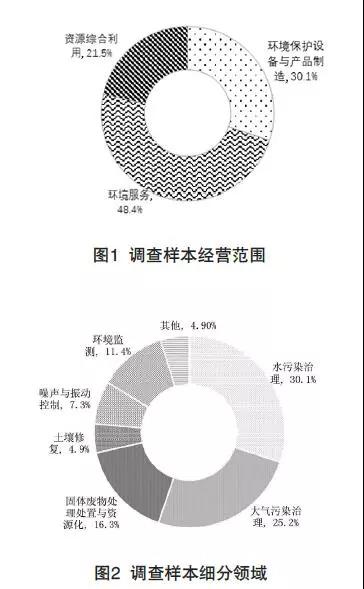本研究遴選了73家環保企業,對其開展環保企業稅收優惠政策的實施情況進行了問卷調查和走訪座談。從經營范圍來看,73家環保企業中,從事環境保護設備與產品制造、環境服務和資源綜合利用的企業占30.1%48.4%21.5%;從細分領域來看,從事水污染治理、大氣污染治理、固體廢物處理處置與資源化、土壤修復、噪聲與振動控制和環境監測細分領域的占比分別為30.1%25.2%16.3%4.9%7.3%11.4%及其他4.9%。見圖1、圖2