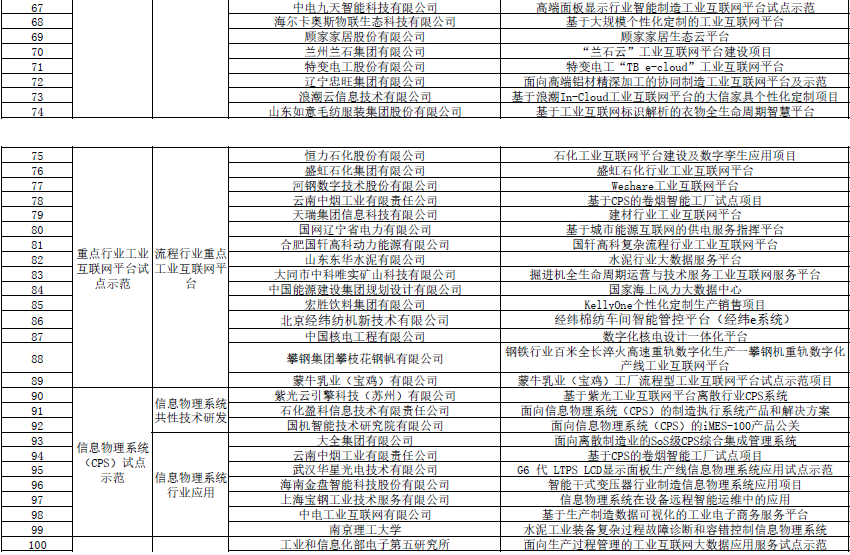 其他試點示范項目有:重點行業工業互聯網平臺試點示范項目38個,分為23個離散行業重點工業互聯網平臺項目,及15個流程行業重點工業互聯網平臺項目。信息物理系統(CPS)試點示范方向共10個項目,包括信息物理系統共性技術研發及信息物理系統行業應用兩個方向。工業互聯網大數據應用服務試點示范共18個項目,包括生產過程管理、大數據精準營銷、精細化能源管理三個方向。工業電子商務試點示范14個項目,包括大企業集采集銷平臺服務轉型及工業電子商務服務平臺兩個方向。中德智能制造合作試點示范6個。