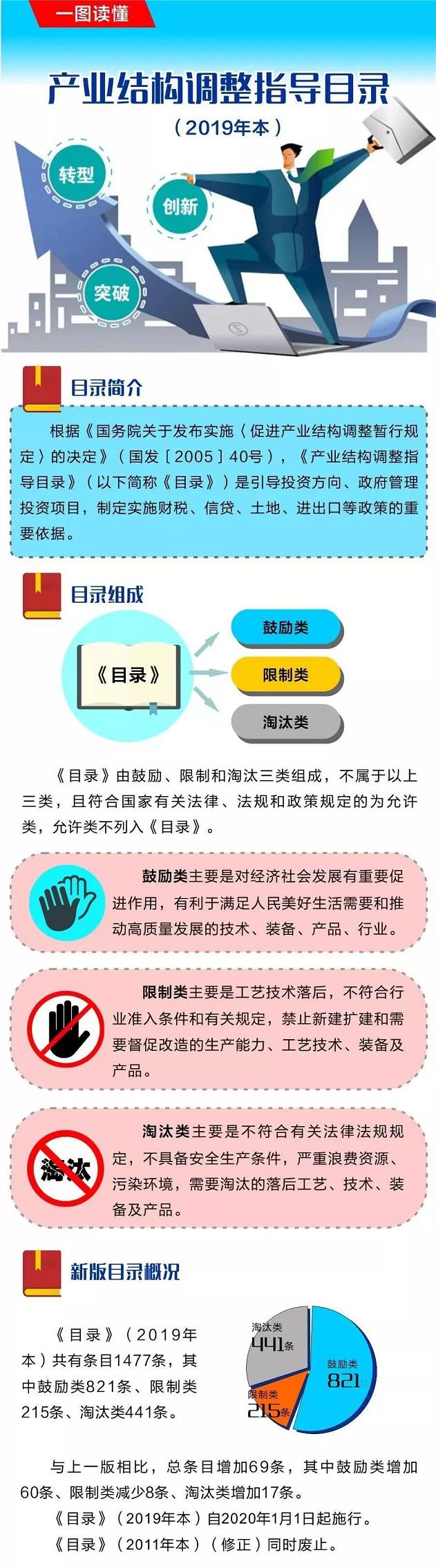 《目錄(2019年本)》共涉及行業48個,條目1477條,其中鼓勵類821條、限制類215條、淘汰類441條。與上一版相比,從行業看,鼓勵類新增“人力資源與人力資本服務業”、“人工智能”、“養老與托育服務”、“家政”等4個行業,將上一版“教育、文化、衛生、體育服務業”拆分并分別獨立設置,限制類刪除“消防”行業,淘汰類新增“采礦”行業的相關條目;從條目數量看,總條目增加69條,其中鼓勵類增加60條、限制類減少8條、淘汰類增加17條;從修訂面看,共修訂(包括新增、修改、刪除)822條,修訂面超過50%。