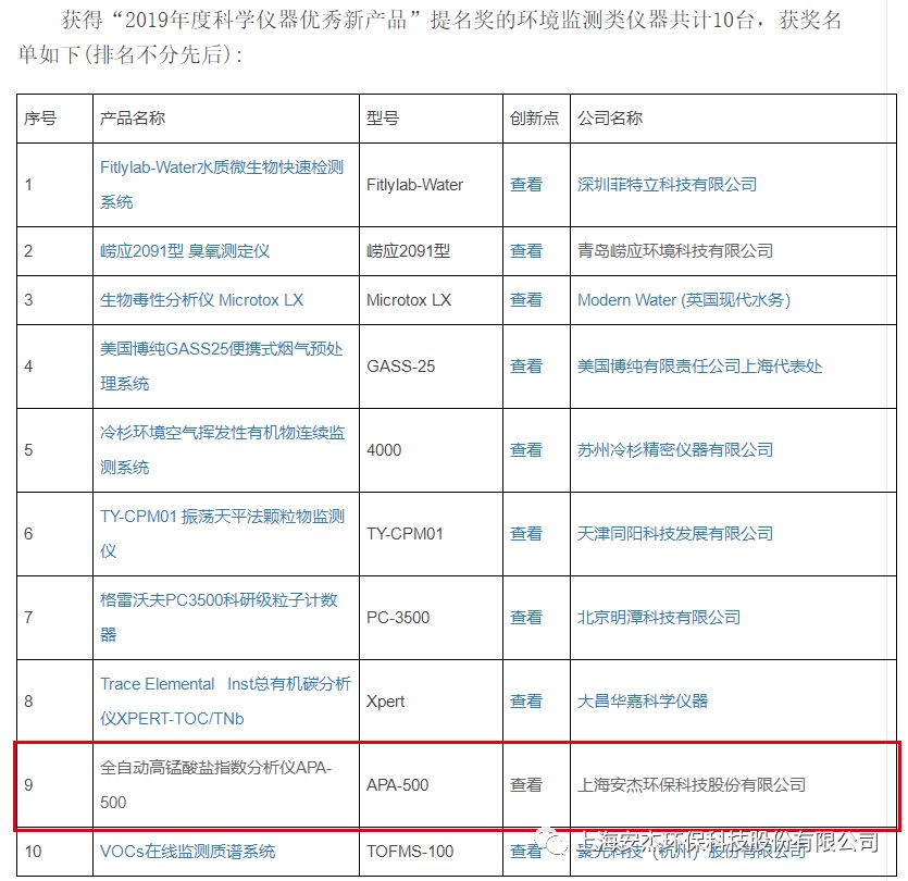 2020年311日,2019年度中國科學儀器行業“優秀新品”評選活動“提名獎”揭曉,安杰科技 APA-500 全自動高錳酸鹽指數分析儀 獲得“2019年度科學儀器優秀新產品”提名獎。