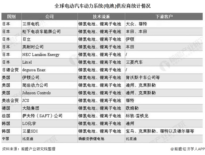全球電動汽車動力系統(電池)供應商統計情況