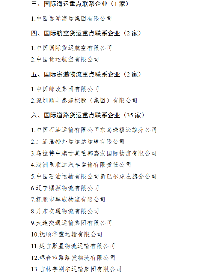 按照國務(wù)院部署要求,工業(yè)和信息化部配合交通運(yùn)輸部、外交部、商務(wù)部等部門,在國務(wù)院復(fù)工復(fù)產(chǎn)推進(jìn)工作機(jī)制下成立了國際物流工作專班,協(xié)調(diào)解決當(dāng)前疫情期間制造業(yè)國際物流中存在的問題。近日,國際物流工作專班公布第一批國際物流運(yùn)輸重點(diǎn)聯(lián)系企業(yè)名單,其中綜合物流企業(yè)4家、中歐班列運(yùn)營企業(yè)10家、國際航運(yùn)企業(yè)1家、國際航空貨運(yùn)企業(yè)2家、國際寄遞物流企業(yè)2家、國際道路運(yùn)輸企業(yè)35家。