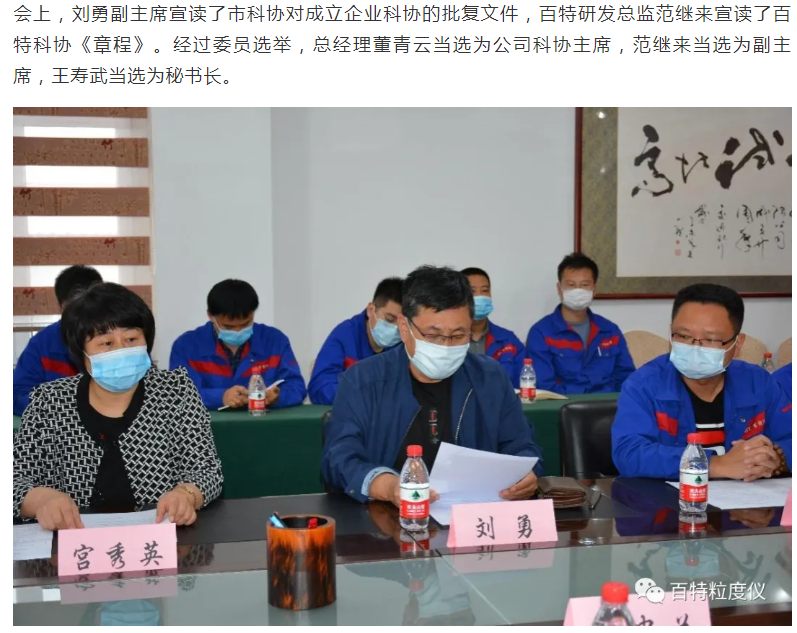 丹東百特儀器有限公司是中國儀器儀表行業協會會員單位,主要產品:智能激光粒度儀,顯微圖像粒度粒形分析儀,粉體綜合特性測試儀,沉降粒度儀,光阻法顆粒計數器,PM2.5監測儀,光阻法粒徑譜儀。為提升公司的創新能力,62日,丹東百特儀器有限公司隆重召開丹東百特科學技術協會成立暨第一次會員會議,丹東市科協主席宮秀英、副主席劉勇等領導到會祝賀,百特公司董事長、總經理董青云,副總經理劉忠蘭等會員參加會議。