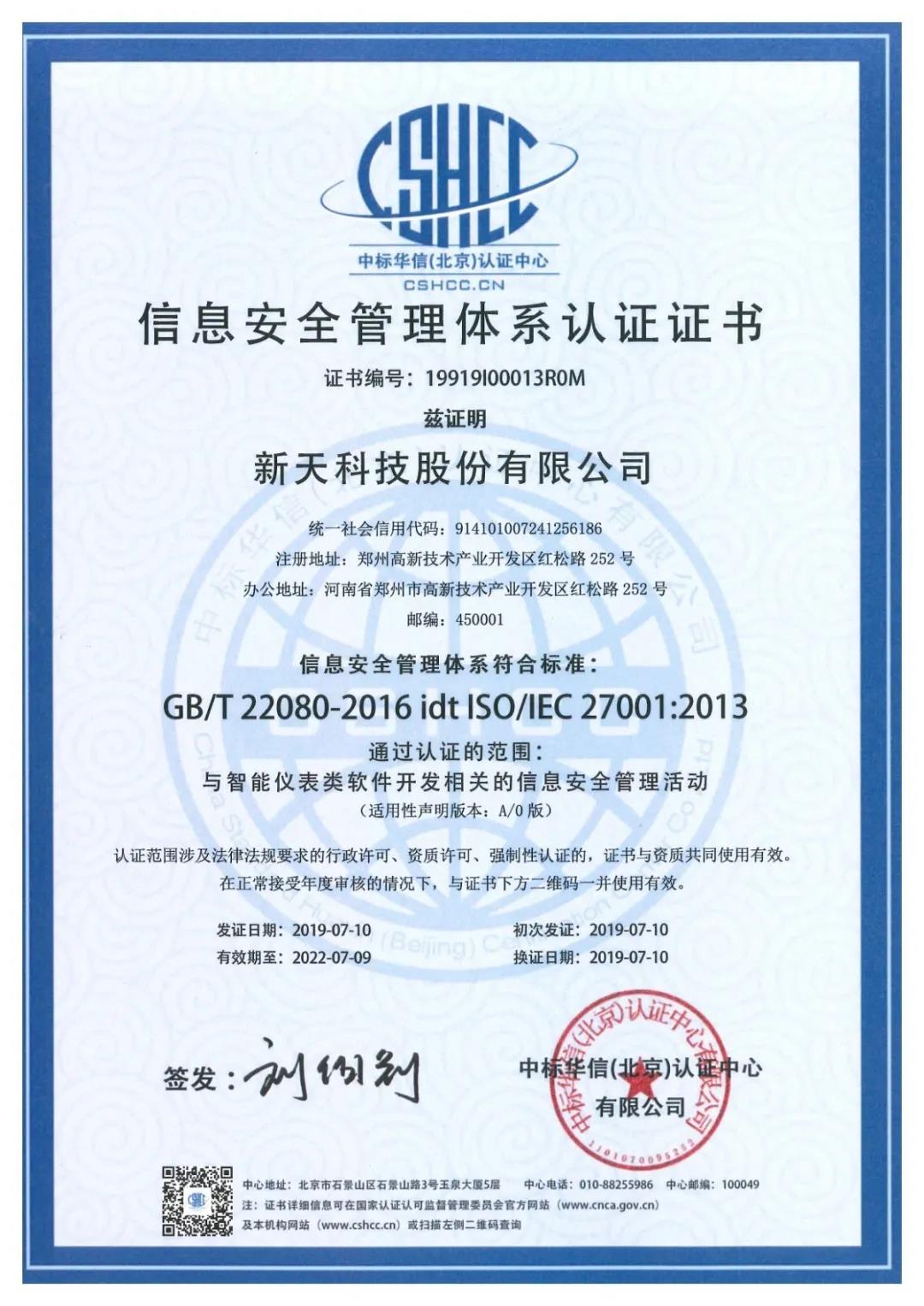 鄭州新天科技獲ISO27001信息安全管理體系認證