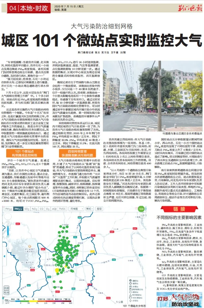 近日,《荊門晚報》以“大氣污染防治細到網格:城區101個微站點實時監控大氣”為題刊發報道,為先河“大氣污染防治精細化管理平臺”點贊!