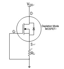 如圖 2 所示,當 VDD 增加時,流過電路的電流 IDS 增加,導致耗盡型 MOSFET 源極電位 VS 升高,即VGS 絕對值 ∣ VGS ∣ 增加,并引起器件導電溝道變窄,電流增加減緩。在此過程中負載RL 兩端的電壓VS 無限接近器件的關(guān)斷電壓∣VGS(OFF)∣,VS≈∣VGS(OFF)∣,即 VS 鉗位在∣VGS(OFF)∣處,不再隨輸入電壓 VDD 的增加而變化。負載 RL 流過的電流 IL (IL = VS / RL)也不隨輸入電壓 VDD 的增加而變化。
