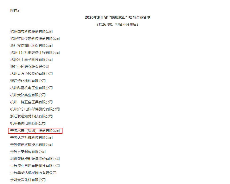 2021年1月13日,浙江省經濟和信息化廳公布“浙江省隱形冠軍”企業,寧水集團成功入選培育名單。
