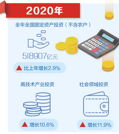 受新冠肺炎疫情沖擊,20201月份至2月份全國固定資產投資大幅下降24.5%,而后降幅逐月收窄,上半年下降3.1%,至前三季度增速實現由負轉正。全年投資比上年增長2.9%,增速比1月份至11月份和前三季度分別加快0.32.1個百分點。