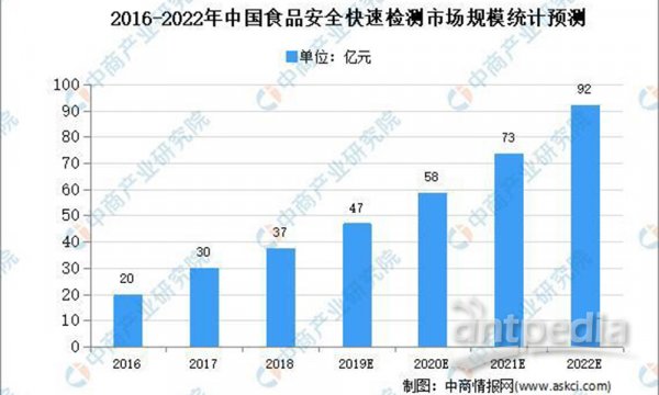 中國食品安全快檢產業化僅僅二十年,在我國分析測試領域,雖是“小荷才露尖尖角”,但發展速度非常迅猛。據中商產業研究院報告顯示,我國食品快速檢測的投入規模約占食品檢測總投入規模的30%,數據顯示,2016年、2017年國內食品快速檢測市場規模分別為19.68億元、29.77億元,預計2017年至2022年的年度復合增長率為25.24%,到2022年國內食品安全快速檢測市場規模(包括試劑和快檢儀器)為91.75億元。快檢行業的迅猛發展來源于幾大方面:首先,新《食品安全法》肯定了快檢在市場監管中的地位。其次,食品安全的分段管理、現場檢測極大拓展了市場對快檢的需求。第三,隨著國家監管力度的加大,更多的污染物成為監管目標,更多食物的安全引起社會的關注。第四,科技部自“十二五”起,對快檢技術給予了持續的支撐。因此快檢技術和產業在中國是蓬勃的新生力量。