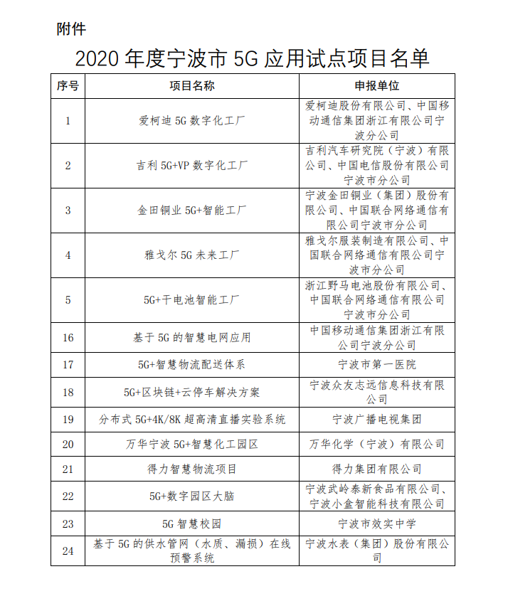 網(水質、漏損)在線預警系統” 被列入2020年度寧波市5G應用試點項