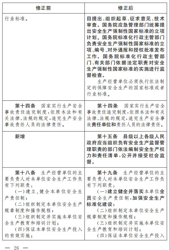 五、第十條增加一款,作為第二款:“國務院有關部門按照職責分工負責安全生產強制性國家標準的項目提出、組織起草、征求意見、技術審查。國務院應急管理部門統籌提出安全生產強 制性國家標準的立項計劃。國務院標準化行政主管部門負責安全生產強制性國家標準的立項、編號、對外通報和授權批準發布工作。國務院標準化行政主管部門、有關部門依據法定職責對安全生產強制性國家標準的實施進行監督檢查。”