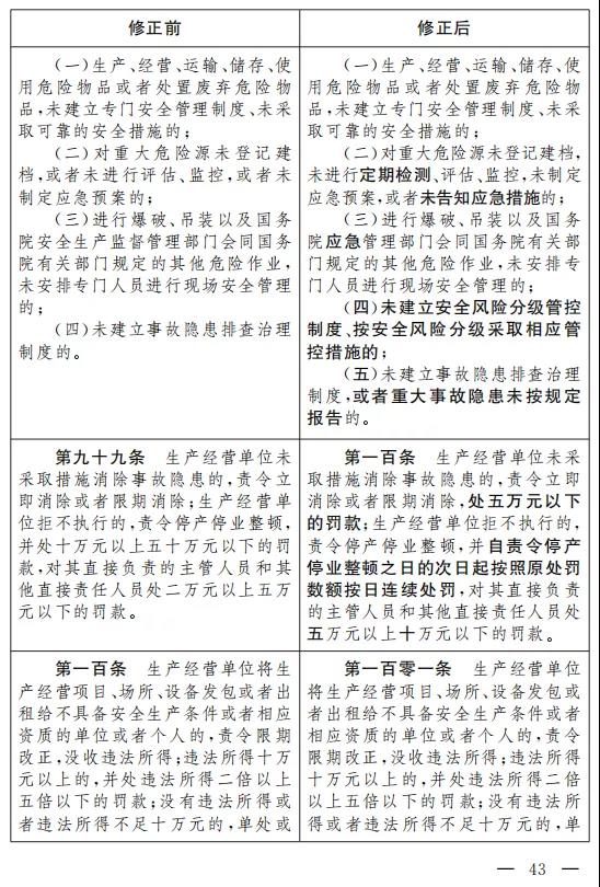 二十九、將第九十九條改為第一百條,修改為:“生產經營單位未采取措施消除事故隱患的,責令立即消除或者限期消除, 處五萬元以下的罰款;生產經營單位拒不執行的,責令停產停業整頓,并自責令停產停業整頓之日的次日起按照原處罰數額按日連續處罰,對其直接負責的主管人員和其他直接責任人員處五萬元以上十萬元以下的罰款。”