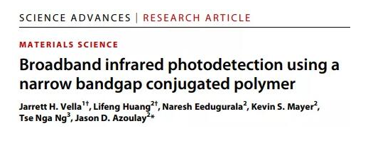 美國南密西西比大學(xué)Jason D. Azoulay等人報(bào)道了一種基于能跨越 SWIR-LWIR 寬帶范圍的供體-受體(D-A)共軛聚合物的高性能紅外光電檢測技術(shù)。該聚合物π共軛骨架內(nèi)的電子相關(guān)性促進(jìn)了高自旋基態(tài)、窄帶隙、長波長吸收和本征導(dǎo)電性。這些以前未觀察到的特性使得從溶液中制造薄膜光電導(dǎo)探測器成為可能,該探測器顯示出大于 2.10×109 Jones 的特定探測率。這種能在室溫下的檢測技術(shù)非常接近當(dāng)前所用的冷卻外延器件的檢測技術(shù)。這項(xiàng)工作為廣泛適用的低成本環(huán)境溫度紅外光電檢測提供了一個(gè)全新的平臺(tái)。該研究以題為“Broadband infrared photodetection using a narrow bandgap conjugated polymer”的論文發(fā)表在《Science Advances》上。
