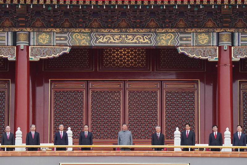 上午7時53分,在歡快的樂曲聲中,習近平等黨和國家領導人來到天安門城樓主席臺,全場爆發出熱烈掌聲。