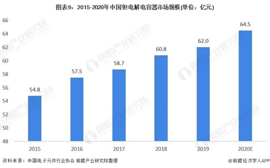根據中國電子元件行業協會,2019年鉭電解電容器市場規模為62億元,較上年增長1.99%,前瞻估計2020年中國鉭電解電容器市場規模約為64.5億元。