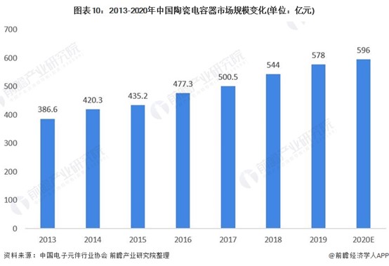 陶瓷電容器為電容器中使用最廣、用量最大的類別,2019年中國陶瓷電容器市場規模為578億元,較2018年增長6.2%,增速在四大品類中位居首位。前瞻測算,2020年陶瓷電容器的市場規模約為596億元。