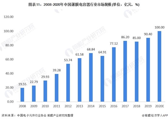 根據中國電子元件行業協會的數據,2019年中國電容器市場規模為1102億元,約占全球市場的71%2020年受5G通訊、大數據、物聯網、汽車電子、新能源及新興產業等下游市場的需求拉動,2020中國電容器市場仍較快發展,前瞻測算2020中國電容器市場規模約為1160億元。
